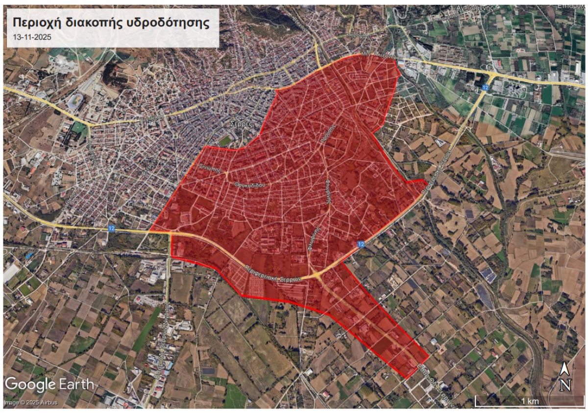 Λόγω προγραμματισμένων εργασιών σύνδεσης των νέων αγωγών του πρωτεύοντος δικτύου ύδρευσης, αύριο Πέμπτη 13-11-2025 και στις ώρες 09:00’ έως 14:00’, θα σημειωθεί διακοπή υδροδότησης στις περιοχές Σιγής, Προφ. Ηλία, Νέου Κόσμου, Κιουπλιών, Σφαγείων, Σαράντα Μαρτύρων, Αγ. Αθανασίου, Νεόκτιστων Αεροδρομίου, περιοχή οδού Προύσσης, επαρχ. οδού Σερρών – Νεοχωρίου, καθώς και περιοχής Κρίνου.
