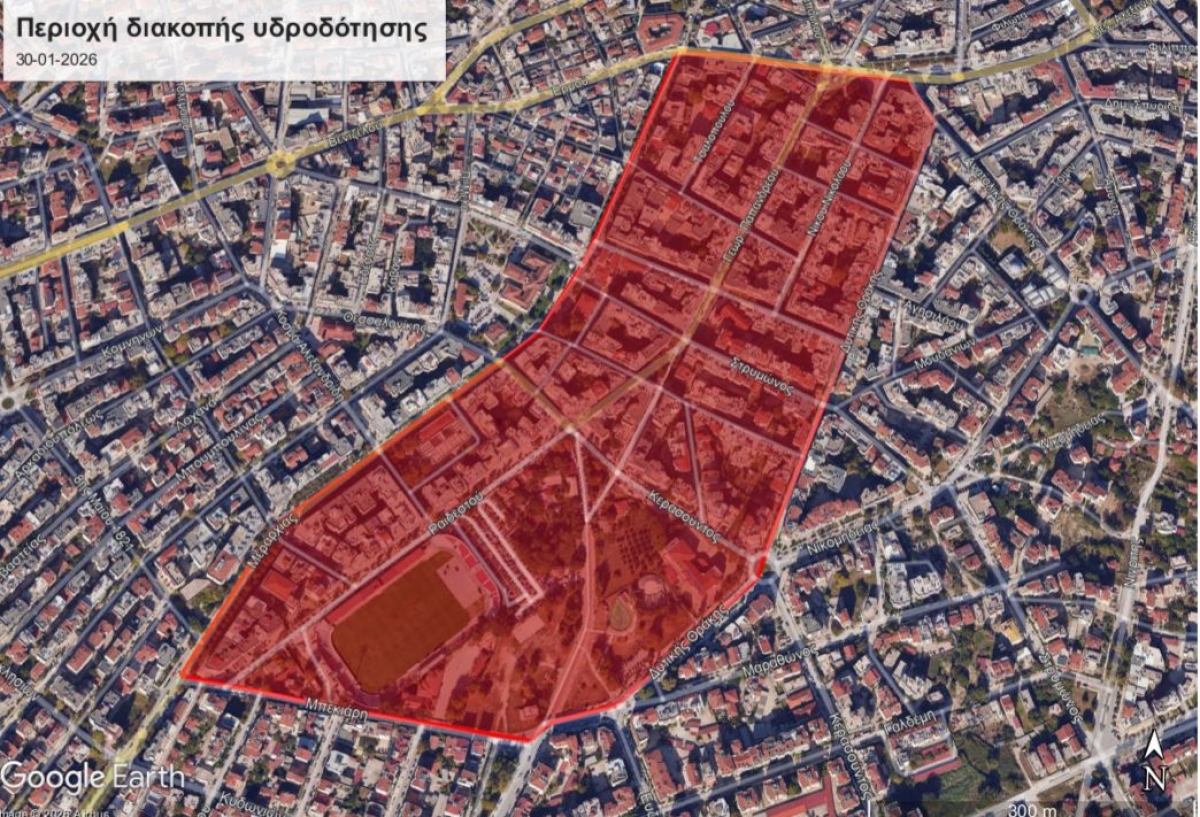 Λόγω αναγκαίας επισκευής βλάβης δευτερεύοντος δικτύου ύδρευσης επί της οδού Ανατ. Θράκης, σήμερα Παρασκευή 30-01-2026 και στις ώρες 11:30’ έως 13:30’, θα σημειωθεί διακοπή υδροδότησης στην περιοχή που περικλείεται από τις οδούς Κωνσταντίνου Καραμανλή, Μεραρχίας, Μπεκιάρη, Δυτικής Θράκης και Διονυσίου Σολωμού.