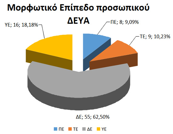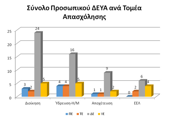 Ειδικότερα στη Διοίκηση, στην Ύδρευση, στην Αποχέτευση και στην Ε.Ε.Λ. απασχολούνται συνολικά και κατά κατηγορία: