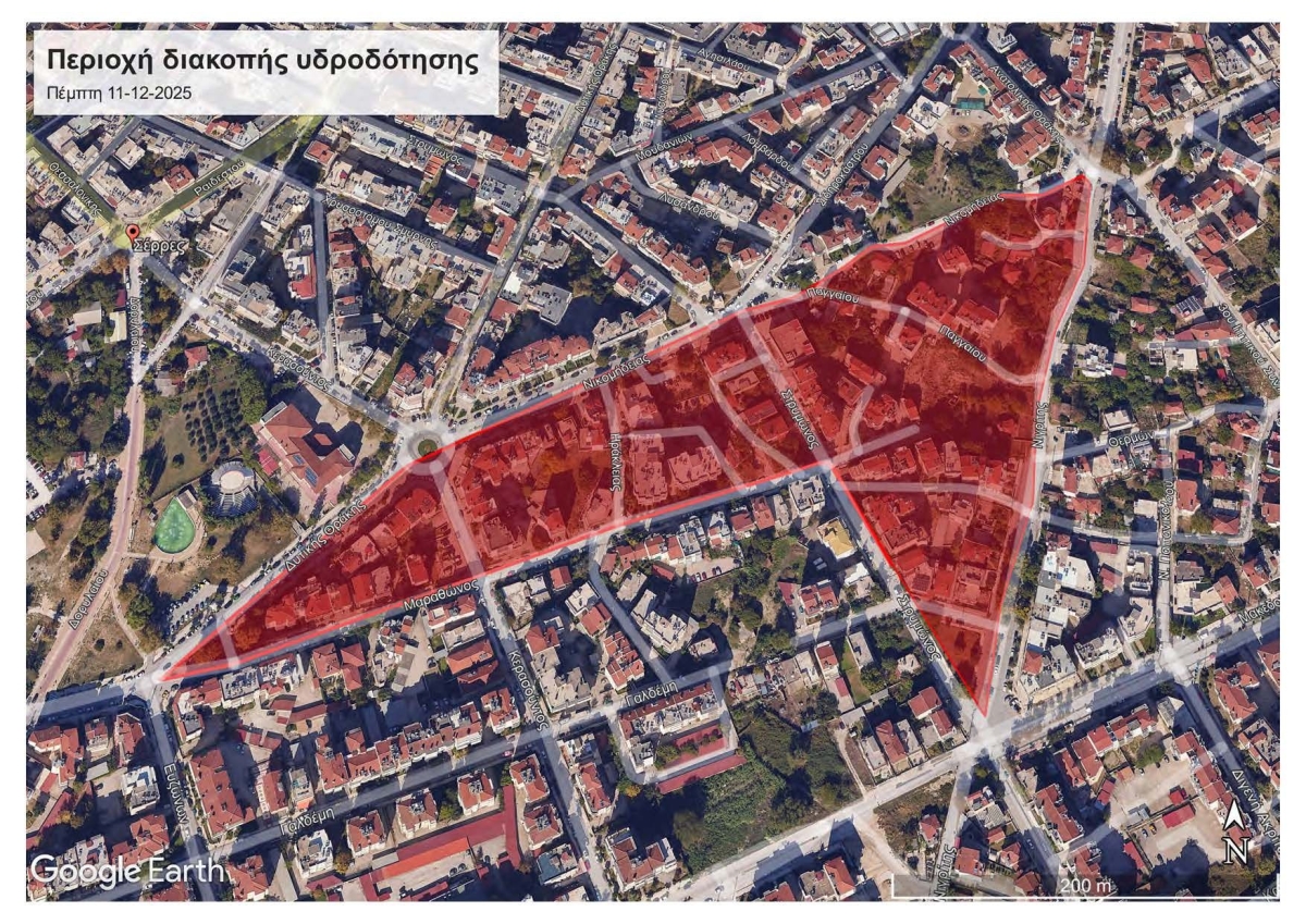 Λόγω αναγκαίων εργασιών ύδρευσης, στα πλαίσια του έργου «Αντικαταστάσεις δικτύων ύδρευσης της πόλης Σερρών», την Πέμπτη 11-12-2025 και στις ώρες 09:30’ έως 13:30’, θα σημειωθεί διακοπή υδροδότησης στην περιοχή που περικλείεται από τις οδούς Δυτ. Θράκης, Μαραθώνος, Στρυμόνος, Νιγρίτης και Νικομηδείας.